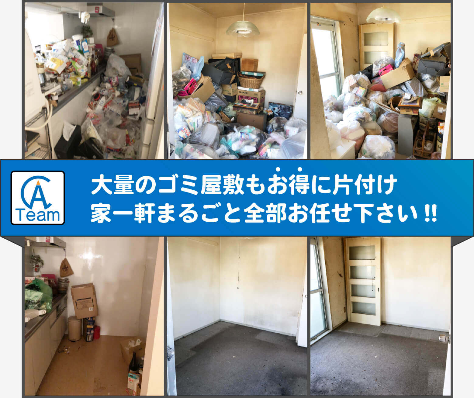 Aチームは不用品回収業者、遺品整理業者、便利屋、引越し業、買取業、など様々な業種のノウハウを有した ドリームチームです。この技術とノウハウを生かして少しでも お客様の困ったに全力で対応することをお約束します。